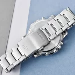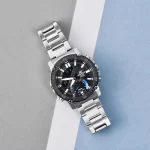 Отображение дней недели на шести языках. Функции перемещения стрелок для беспрепятственного просмотра информации на цифровых дисплеях, поиска телефона и отключения/включения звука по расписанию. Заводная головка с защитой. Раскладывающаяся тройная застежка, расстегиваемая одним касанием. Предохранительная защелка на браслете препятствует случайному расстегиванию. Водозащита 100 WR подходит для плавания с маской, трубкой и обычного плавания.