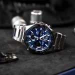 Беспроводная технология Bluetooth® со сверхнизким потреблением энергии для синхронизации со смартфоном. При подключении к смартфону часы автоматически корректируют текущее время, в том числе переход на зимнее/летнее время, копируют настройки мирового времени более чем для 300 городов. Приложение EDIFICE Connected позволяет вести журнал показаний секундомера и прохождения этапов, вычислять разность между заданным временем и временем этапа. Память на 200 этапов. Измерение скорости отображается на ретроградном циферблате в положении 4 часа. Функция перемещения стрелок для беспрепятственного просмотра информации на цифровых дисплеях, включения/отключения звука и поиска телефона. Заводная головка с защитой. Браслет с тройной раскладывающейся застежкой, расстегиваемой одним касанием. Водозащита 100WR подходит для плавания с маской, трубкой и обычного плавания. 5 будильников, ежечасный сигнал, стекло минеральное. Календарь автоматический: число, день недели, месяц (до 2099г)