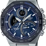 Пронизанные духом скорости, эти часы созданы для сильных и смелых мужчин. Мужские часы Casio Edifice ECB-950DB-2A (Касио Эдифис) Питание от солнечной энергии Tough Solar - высокоэффективная солнечная батарея, аккумулятор, индикатор низкого заряда батареи. Функция автоматического сохранения энергии. Время работы аккумулятора без подзарядки приблизительно 6 месяцев, при включенной функции сохранения энергии приблизительно 19 месяцев. Двойная подсветка Super Illuminator с функцией Afterglow (для подсветки не нужно удерживать кнопку, время послесвечения настраивается 1,5 или 3 сек): одновременно подсвечивается аналоговый циферблат и цифровой дисплей. Цвет подсветки: белый. Светонакопительное покрытие Neobrite обеспечивает длительное послесвечение в темноте даже после кратковременного нахождения на свету. 12-ти и 24-х часовой формат времени. Часы-хронограф с секундомером и тахиметром. Секундомер с разрешениями показаний: 1/1000 сек (до 1 ч) и 1/10 сек (после 1 ч) и временем измерения 24 ч. SPLIT-хронограф. Таймер обратного отсчета от 1 сек до 24 ч. Мировое время – 39 городов (39 часовых поясов). Автоматический переход на зимнее и летнее время, возможность включения/отключения данной функции.