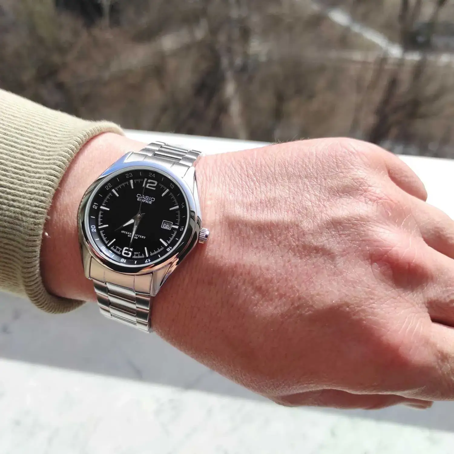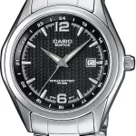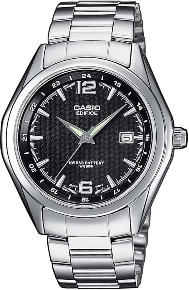 Наручные часы Casio Edifice (Касио Эдифис) EF-121D-1A со спортивным характером. Окошко даты. Корпус и браслет стальной, браслет с раскладывающейся застежкой. циферблат черный, водозащита 100 WR подходит для плавания с маской, трубкой и обычного плавания. Подсветка люминесцентные стрелки и метки, стекло минеральное, устойчивое к возникновению царапин.