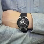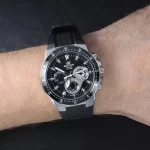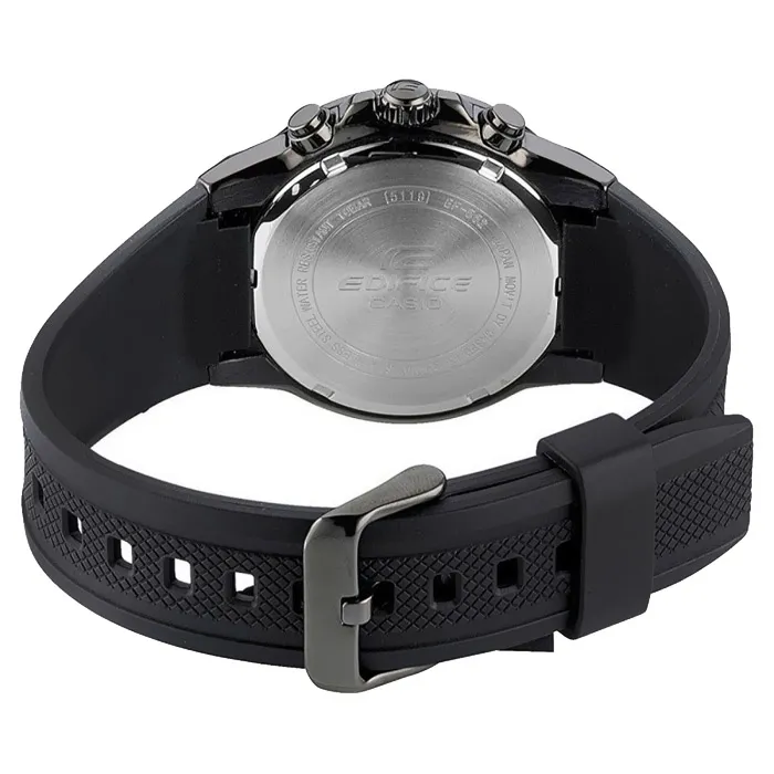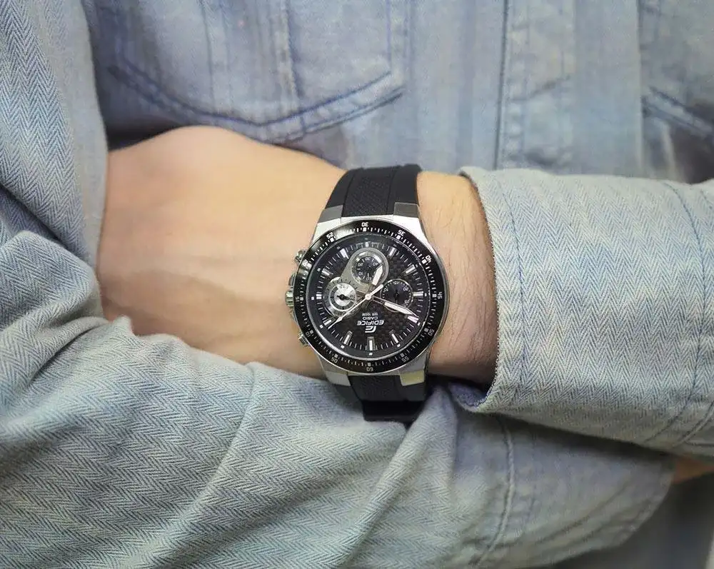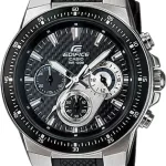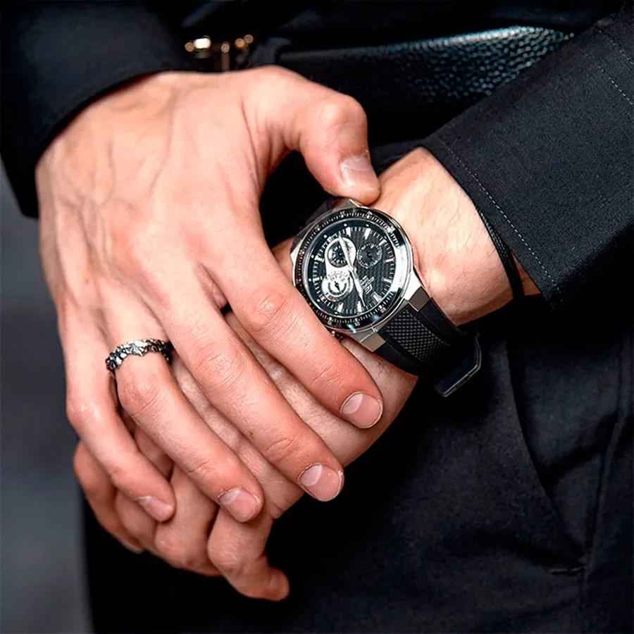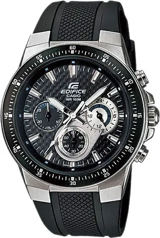 Наручные часы Casio Edifice (Касио эдифис) EF-552-1A с хронографом в гоночном стиле - отличный выбор для покорителей трасс. Хронограф с секундомером точностью 1 сек и временем измерения 30 мин. Стрелки и метки покрыты люминесцентным напылением (светятся в темноте). Задняя крышка с винтовым фиксатором. Браслет каучуковый, водонепроницаемость WR 100, стекло минеральное.