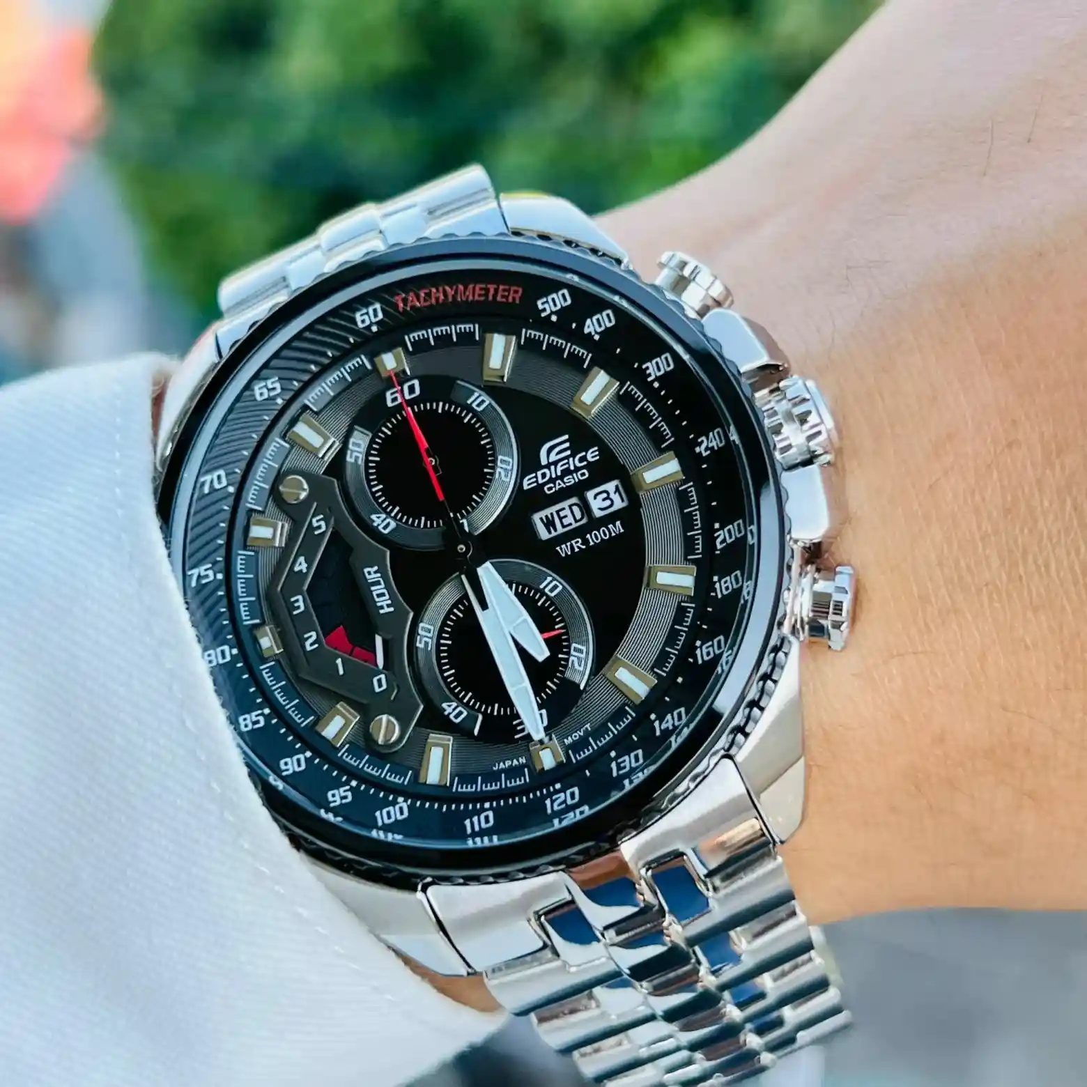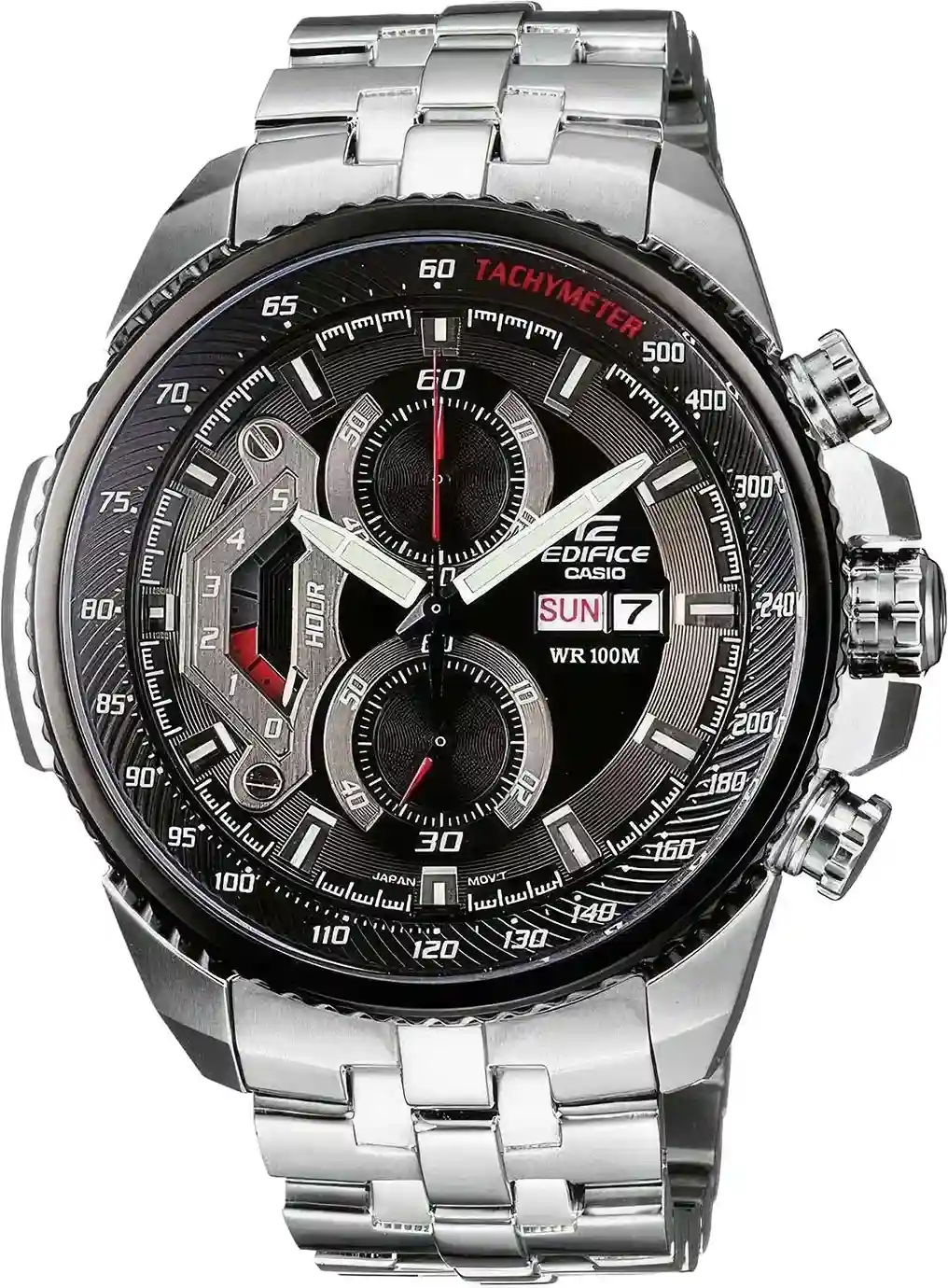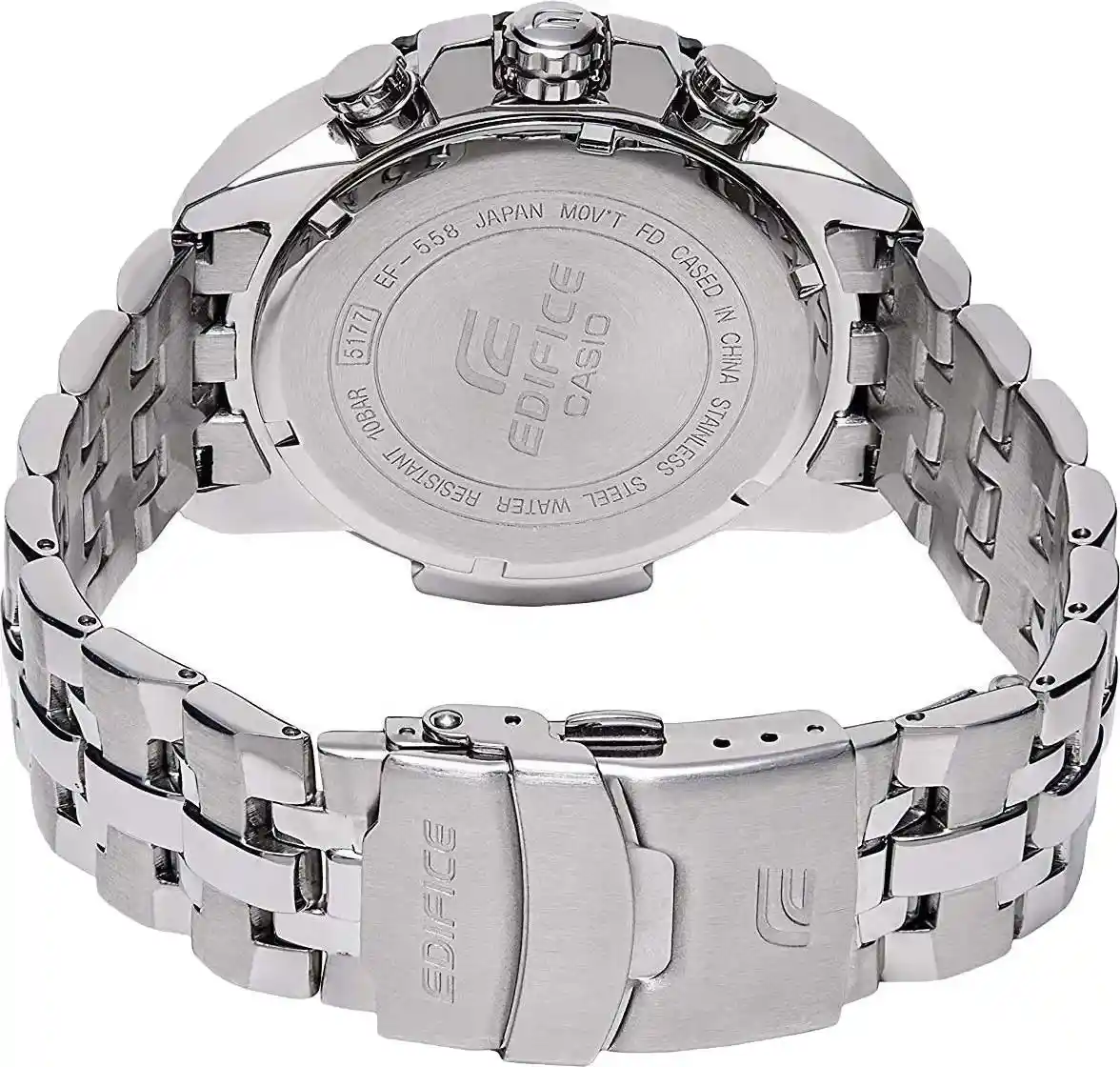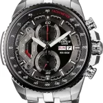 Наручные часы Casio Edifice (Касио эдифис) EF-558D-1A с хронографом. На данной модели отображается день недели и текущая дата. Секундомер может отсчитывать до 5 часов с шагом 1 сек. На циферблате присутствует шкала тахиметра для измерения средней скорости движения. Стрелки и метки покрыты люминесцентным покрытием. Завинчивающаяся задняя крышка и заводная головка. На корпус частично нанесено стойкое PVD покрытие. Раскладывающаяся застежка, расстегиваемая одним касанием. Стекло минеральное выпуклое. Водонепроницаемость WR 100.