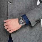 Стрелки и метки покрыты люминесцентным напылением (светятся в темноте). Циферблат с метками в виде штрихов. Часы-хронограф с секундомером точностью 1/10 сек и временем измерения 1 ч. Заводная головка с защитой. Задняя крышка с винтовым фиксатором. Батарея рассчитана на 3 года. Стальной браслет с раскладывающейся застежкой. Стекло минеральное, водонепроницаемость 100 WR.