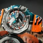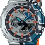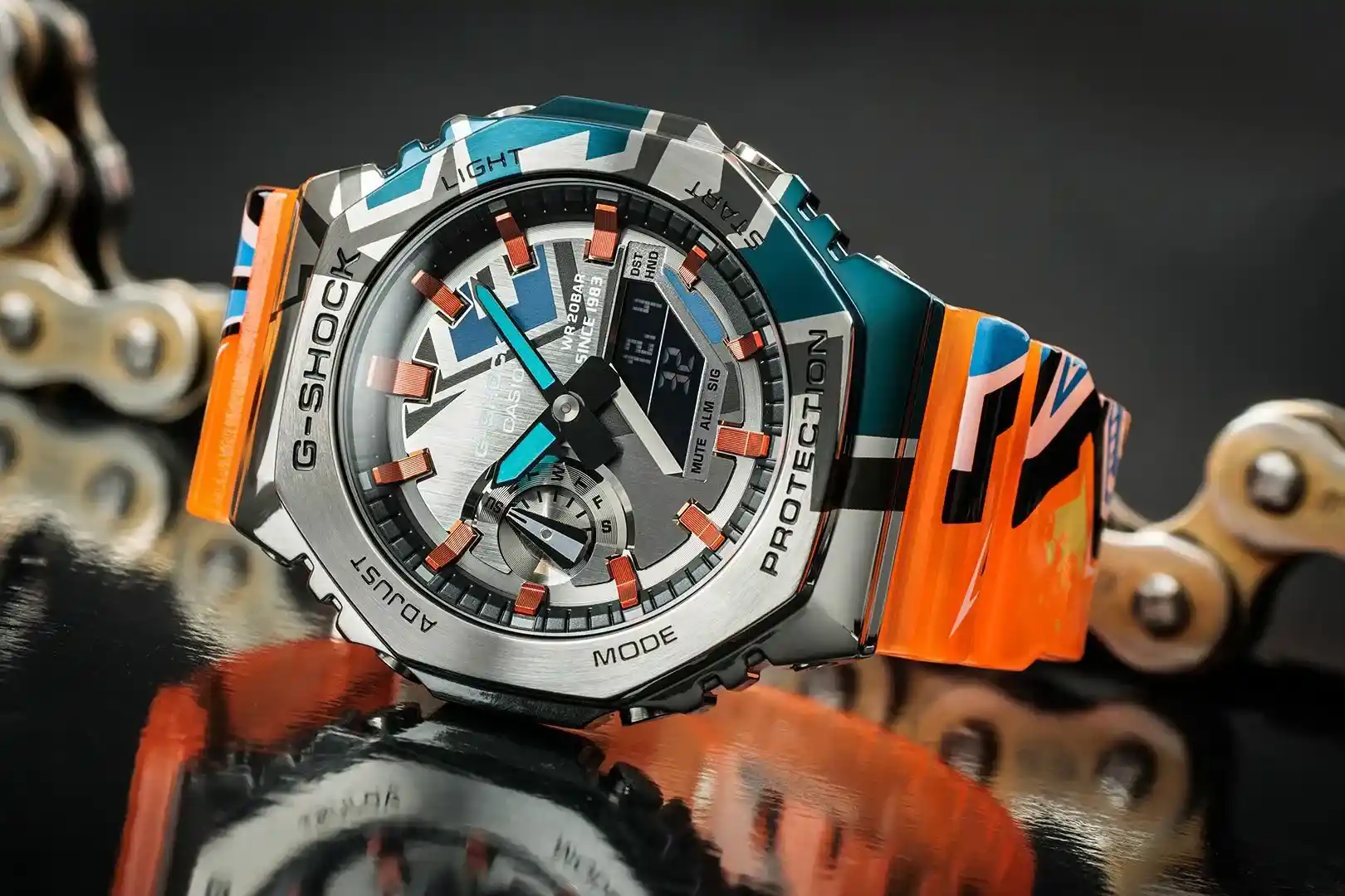 Модель является редкой лимиткой и отсылает нас своим внешним видом к девяностым годам прошлого столетия, к эпохе расцвета уличной культуры граффити и стрит-арта. Именно часть олдскульного граффити и нанесено на корпус модели, а оранжевый ремешок венчает цифра 1983 — год создания самых первых часов Casio G-Shock.