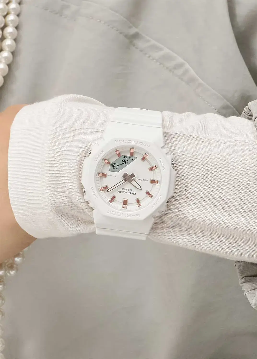 Женские часы Casio G-Shock (Касио Джи-Шок) GMA-P2100M-7A созданные для представительниц прекрасного пола, которые живут яркой спортивной жизнью. Модель является уменьшенным вариантом часов из мужской серии джишоков GA-2100, что позволяет ей оптимально выглядеть даже на самых небольших и изящных женских запястьях.